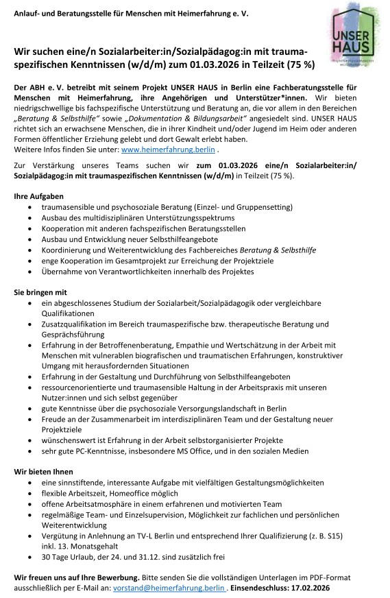 Wir suchen eine/n Sozialarbeiter:in/Sozialpädagog:in mit traumaspezifischen Kenntnissen (w/d/m) zum 01.03.2026 in Teilzeit (75 %)