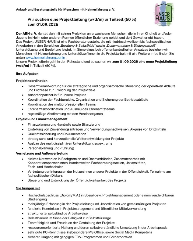 Während der Eröffnungswoche haben Interessierte Gelegenheit, das Team und die Angebote der neuen Einrichtung kennenzulernen. „UNSER HAUS” ist ein Nachfolgeprojekt der Anlauf- und Beratungsstelle ABeH, die für die Umsetzung der beiden mittlerweile beendeten Fonds Heimer-ziehung (Ost und West) zuständig war. Träger ist der gemeinnützige Verein „ABH – Anlauf- und Beratungsstelle für Menschen mit Heimerfahrung“.