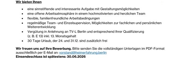 Ihr könnt Euch gerne noch bis Freitag, dem 01.08. entweder per Mail unter info@heimerfahrung.berlin oder telefonisch unter der 030 – 857 577 61 anmelden.